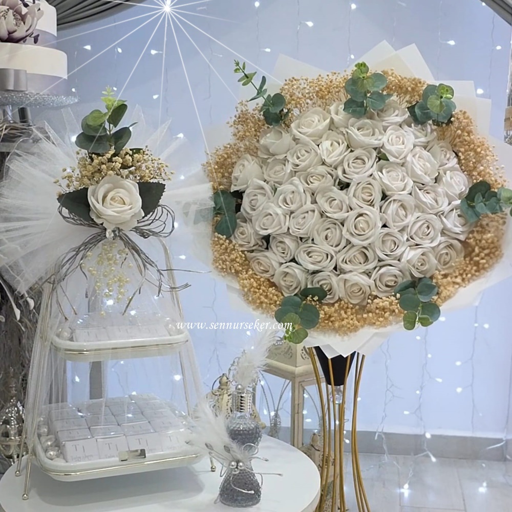 41 adet beyaz kadife gülden oluşan bu özel buket, cipso ve okaliptus detaylarıyla zenginleştirilerek doğallığı ve saflığı bir araya getiriyor.Şık 2 katlı sunumluk üzerinde yer alan, kişiye özel isim baskılı çikolatalar ile tamamlanan bu set; kız isteme, söz ve nişan törenlerinde göz kamaştırıcı bir detay oluşturur.