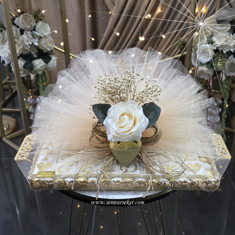 Tamamlayıcı Lezzetler: Tepsi içini dolduran Melodi marka parlak altın ve beyaz çikolatalı badem drajeler.