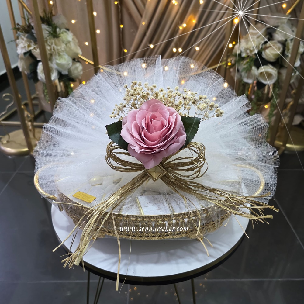 Altın renkli oval kulplu, içi aynalı tepside yer alan bu özel set; söz, isteme, nişan ve kız isteme törenleri için kusursuz bir tercih sunar.Gösterişli tül süslemesi, büyük pembe gül detayı ve doğal görünümlü aksesuarlarıyla hem modern hem de zarif bir sunum oluşturur.