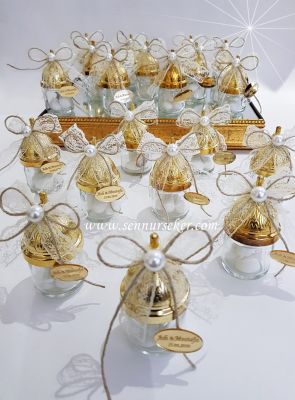 Altın kubbeli kavanoz nikah şekeri modelimizin içinde 4 adet nikah şekeri bademi bulunmaktadır. Üzerinde dantel, jüt ip ile fiyonk atılıp inci ile birleştirilmiş olup farklı kurdale ile de bağlama yapılabilir. Pleksi isimliği oval çalışılmış olup yine kalp veya yuvarlakta çalışılabilir.
