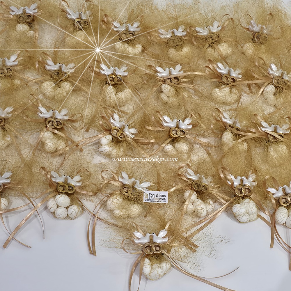 Alyans ve kuş figürü; sevgi, sadakat ve birlikteliği simgelerken, zarif tül ve altın tonlu süslemeler ürüne göz alıcı bir estetik kazandırır. Kişiye özel isim kartı sayesinde davetlilerinize hem şık hem de anlamlı bir hatıra bırakabilirsiniz.
