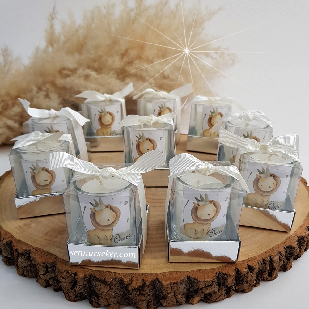 Aslan Kral mum hediyeliğimiz, Asetat kutu içinde bardakta mum ve üzerine istediğiniz desende stickerı ile bebek mevlütlerinizde ve sünnet cemiyetlerinizin şık bir hediyeliği olacaktır.