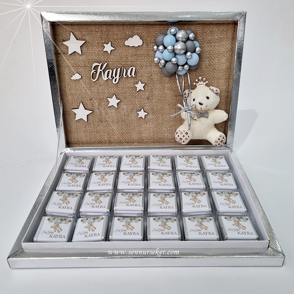 Bebek çikolatası özel tasarım pleksi Bebeğin ismi ve Ayıcık ve balonlarla süslenmiş kutusu ile sunum şıklığı sağlamaktadır.72 adet desenli, isim baskılı çikolata ile hazırlanmıştır.