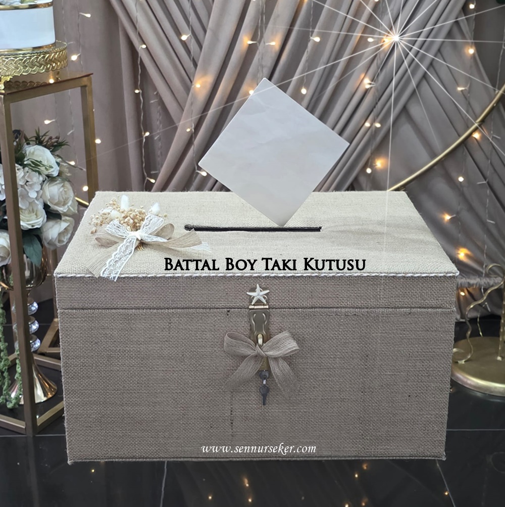 Altın renk kilit mekanizması hem güvenli hem de dekoratif bir görünüm sunar. Geniş iç hacmi sayesinde takılar, zarf ve özel eşyalar düzenli bir şekilde muhafaza edilebilir. İsteğe bağlı olarak kutunun üzerine pleksi malzeme ile gelin–damat isimleri ve tarih yazılarak kişiye özel hale getirilebilir.
