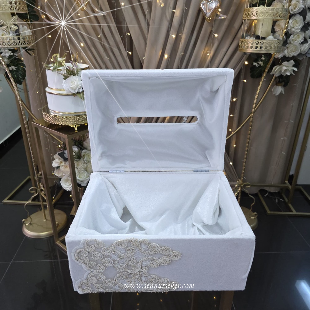 Düğün, nişan, söz gibi özel günlerde "zarf takı sandığı" olarak da kullanılabilen bu kutu, aynı zamanda ev dekorasyonuna da zarif bir dokunuş sunar. Beyaz kadife kumaş dış kaplaması ve yumuşak iç yüzeyi sayesinde takılarınız çizilmeden muhafaza edilir.