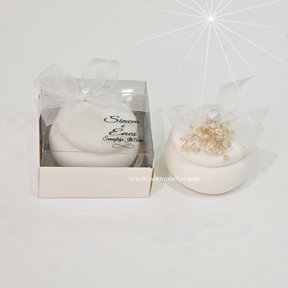 Zarif ve sade tasarımıyla özel günlerinize şıklık katan beyaz kapaklı mum modeli, cipso çiçek, organze kurdele ve inci detayıyla romantik bir görünüm sunar. Nikah, düğün, nişan, söz ve kına organizasyonları için anlamlı ve estetik bir hediyelik seçeneğidir.