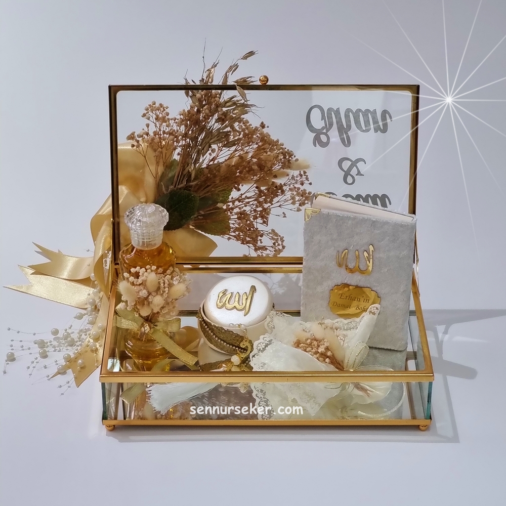 Damat Bohça Seti Mendil, Yasin, Kutulu Tesbih, Kolonyası ile damat bohçası için kişiye özel isimli olarak tasarlanmaktadır.