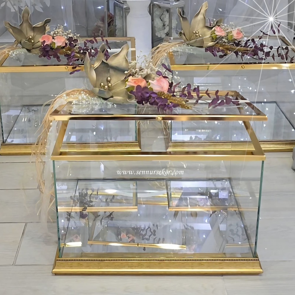 İsteğe göre altın-gümüş renk seçeneği mevcuttur.Bohça kutu ebat 46x35x30 cm dirCam bohça kutusunun diğer ebat için iletişime geçiniz.