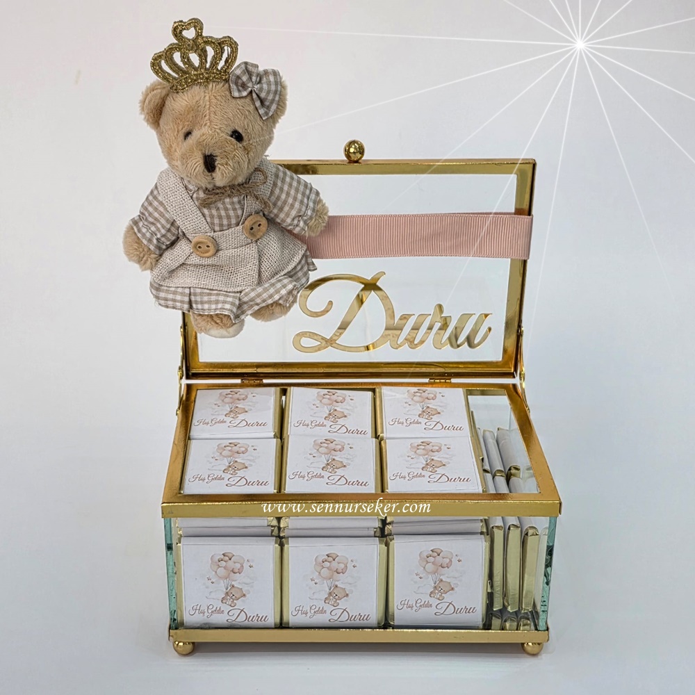 Cam Kutuda İsimli Bebek Çikolatası, 75 Adet isim baskılı ayıcıklı desenli sargılı madlen çikolata ile hazırlanmış olup, Süslemesinde takım olarak ayıcık ve Bebişin ismi pleksi ile kutuya yazılmıştır.