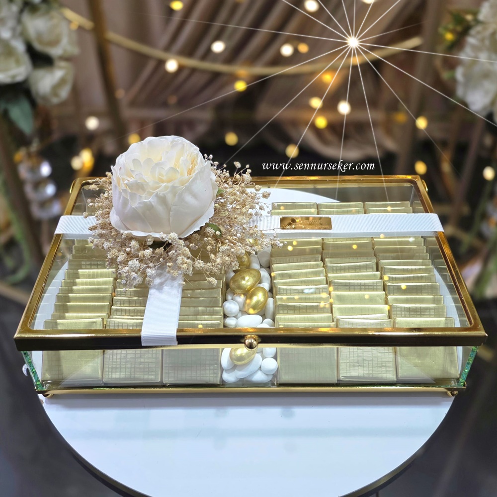En özel anlarınıza zarif bir dokunuş! Cam kutu içerisinde sunulan sargılı madlen çikolatalar, Özel Şakayık Çiçekle süsleme ve İstenirse kişiye özel pleksi isim etiketiyle birleşerek şıklığıyla göz kamaştırıyor. Söz, nişan ve isteme törenlerinde hem lezzetiyle hem sunumuyla fark yaratır.