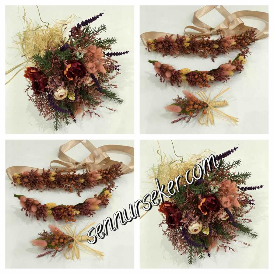 - Gelin kemeri, gelin buketi, damat yakası doğal kuru çiçekler ve yapay çiçeklerle tasarlanmıştır