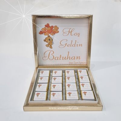 İsim Baskılı Kutuda Bebek Çikolatası, Altın kutuda kapak baskılı 48 adet isim baskılı çikolata setidir.
