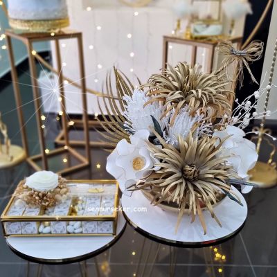 Altın metal vazoda tasarım yapay isteme, söz, nişan çiçeği ve takım çikolata setidir