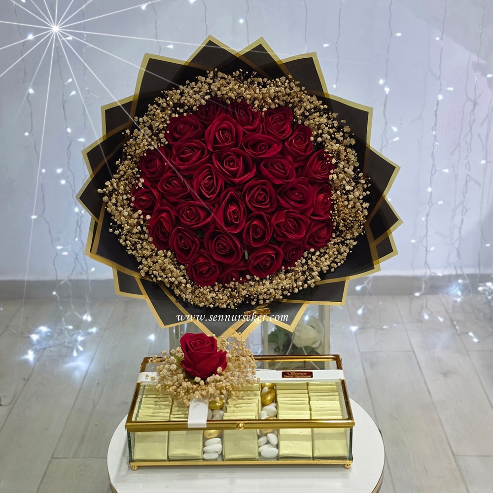 Kırmızı güllerin aşkı simgeleyen büyüleyici görünümü, altın detaylarla zenginleştirilmiş çikolata sunumu ile birleşerek hem görsel hem de lezzet açısından kusursuz bir deneyim sunar.