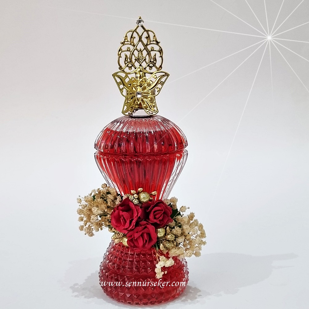Kırmızı kız İsteme, Söz, Nişan Merasimi İkramlık Kolonyası , özel cam şişe ve kelebek desenli kapaktan oluşan şık bir üründür.