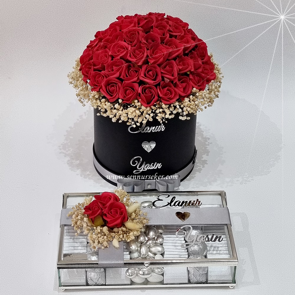 Kırmızı Kutu Güllü, Cam Kutuda İsimli İsteme, Söz, Nişan Çikolatası setinde Siyah gül kutusunda 55-60 adet gibi kırmızı güller ve cipsolar ile hazırlanmış olup, kutunun üzerinde de pleksiden gelin ve damat isimleri yazılmıştır.