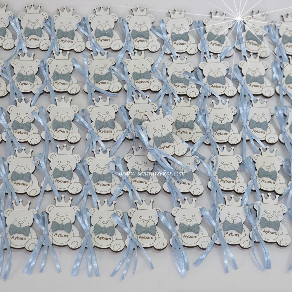 Sevimli ayıcık tasarımı, ışıltılı papyon detayı ve uyumlu saten kurdele süslemesi ile hem zarif hem de dikkat çekici bir görünüme sahiptir. Magnetli yapısı sayesinde misafirleriniz bu anlamlı hediyeyi uzun yıllar hatıra olarak saklayabilir.