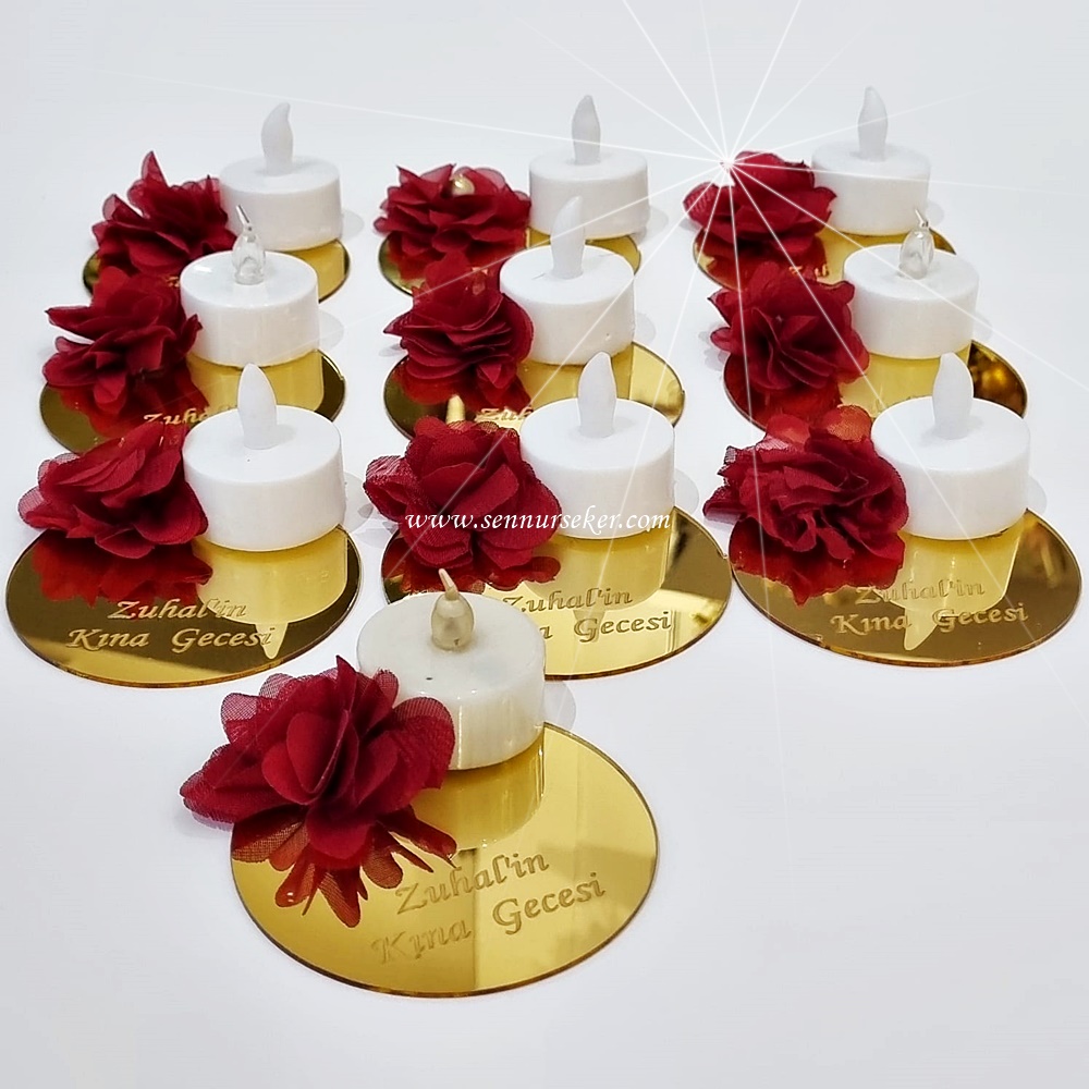 İsimli ve ledli kına el mumu organze çiçek ile süslemmiştir.