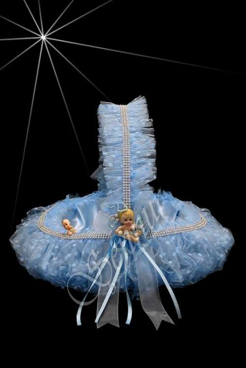 Bebek sepeti mavi saten kumaş , Mavi puanlı tül, Krem inciler ve mavi bebiş bibloları ile süslenmiştir