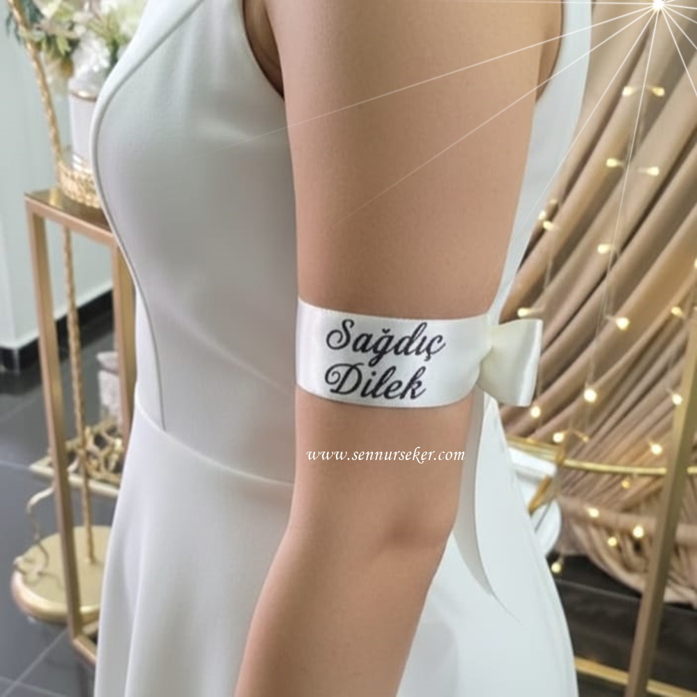 Özel günlerinize şıklık ve anlam katan isim baskılı sağdıç kurdelesi, düğün ve nişan organizasyonları için zarif bir tamamlayıcıdır. Görselde yer aldığı gibi kol bandı formunda tasarlanmış olup, sağdıçlar için özel olarak hazırlanır.