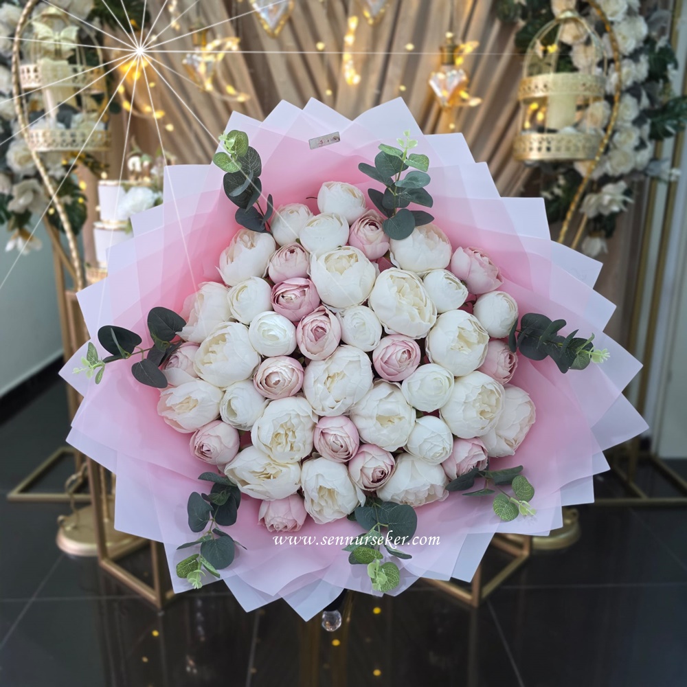 Pudra ve beyaz tonlarının yumuşak geçişiyle hazırlanmış şakayık çiçeklerinden oluşan bu özel buket, okaliptus yaprak detayları ile doğal ve romantik bir görünüm sunar.Kız isteme, söz ve nişan törenlerinizde sade ama etkileyici bir duruş sergileyen bu el buketi, şıklığıyla her fotoğrafa zarafet katar.