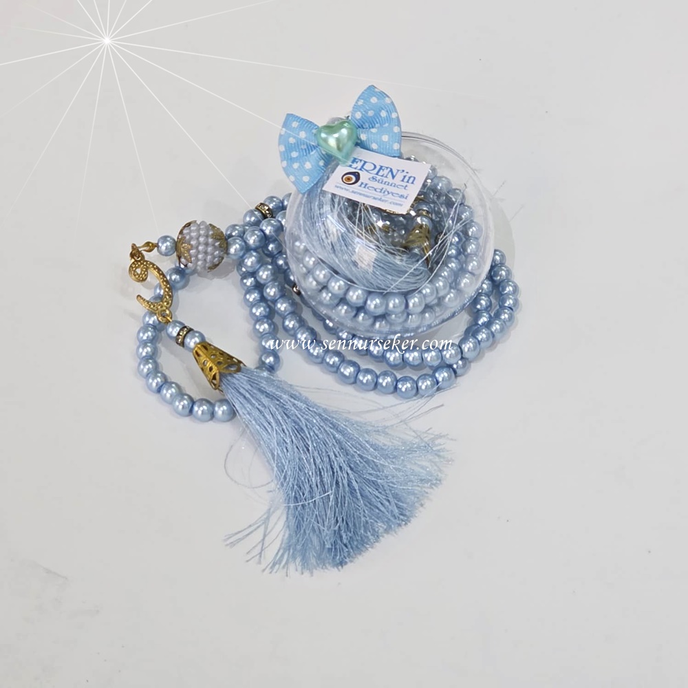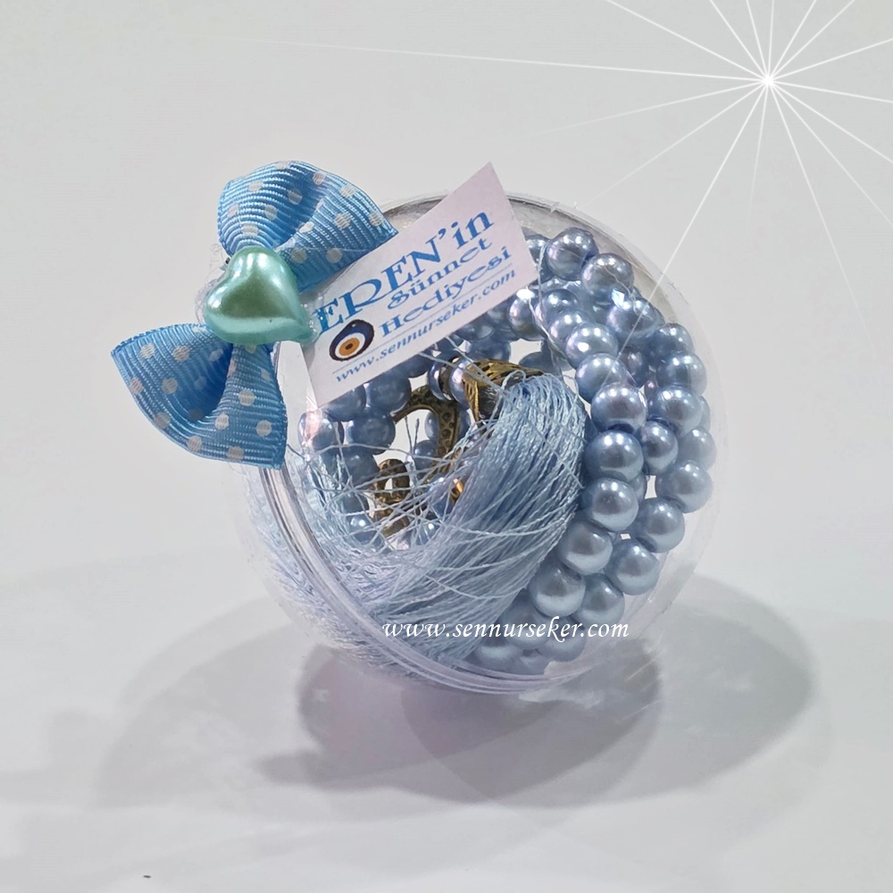 Şeffaf küre kutu içerisinde yer alan inci görünümlü tesbih, şık fiyonk ve inci detaylarıyla süslenerek hazırlanmıştır. Hem sünnet mevlüdü hem de bebek mevlidi organizasyonları için zarif bir hediyelik seçeneğidir.