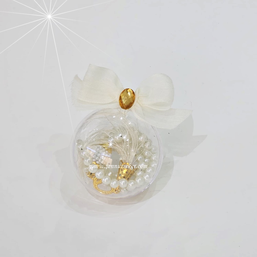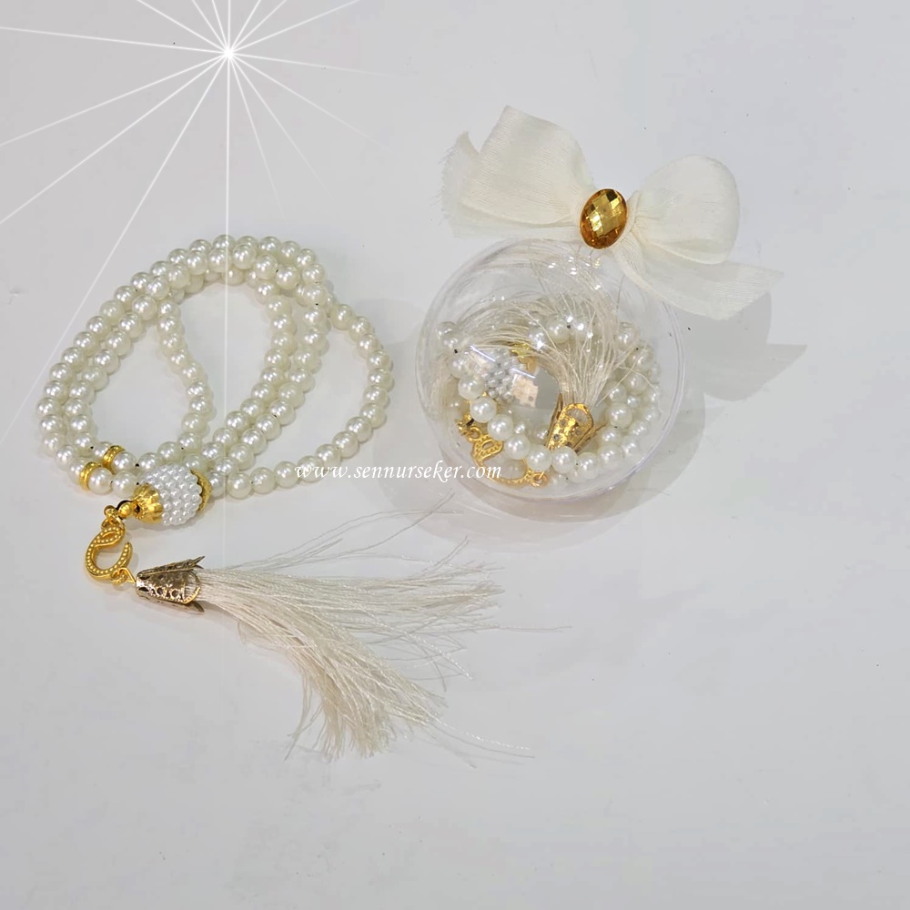 Şeffaf küre kutu içerisinde yer alan inci görünümlü tesbih, şık fiyonk ve inci detaylarıyla süslenerek hazırlanmıştır. Hem sünnet mevlüdü hem de vefat mevlidi organizasyonları için zarif bir hediyelik seçeneğidir.