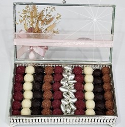 Trufel Şöleni Cam Kutuda İsteme, Söz veya Nişan Çikolatasında 54 Adet Çok özel trufel çikolatalar ve Parlak gümüş drajeler ile çalışılmıştır. İstenirse farklı spesial çikolatalarda kullanılabilir.