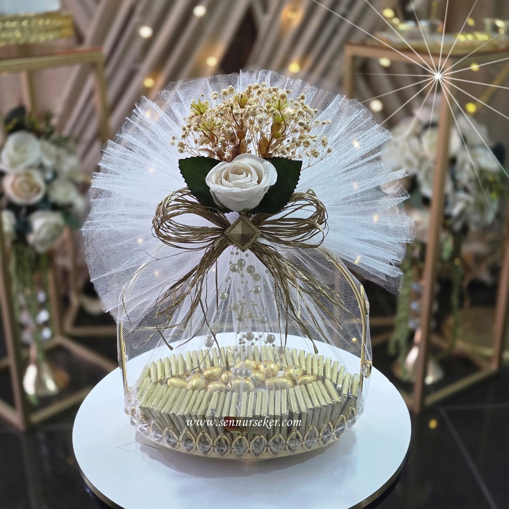 Süsleme Detayları: Tül paketleme, şık fiyonk, yapay çiçek ve inci detaylarıyla tamamen hazır şekilde gönderilmektedir.
